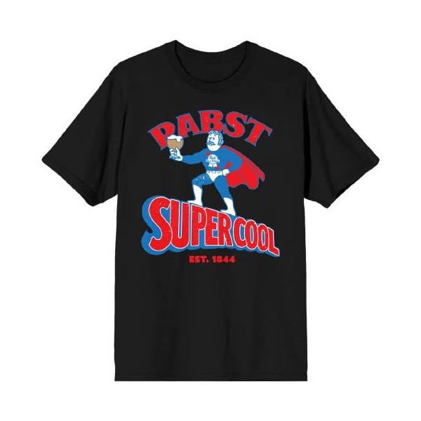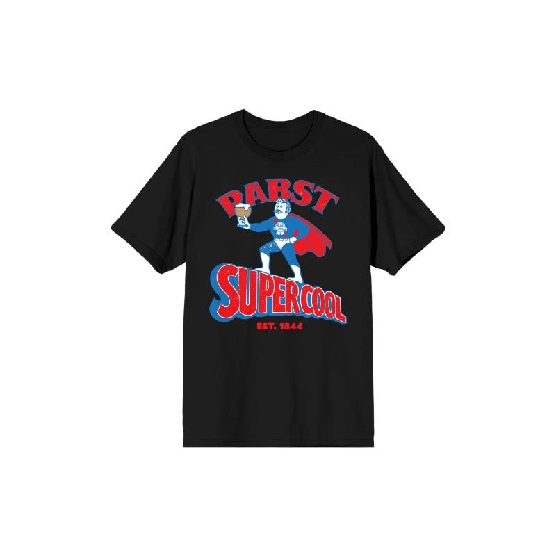 - GRAPHIC TEE: A bartender wears a superhero costume and comes to the rescue with a glass of beer on this graphic tee while red letters below him read, “Supercool.” Fans of Pabst Blue Ribbon beer will love this fun design.