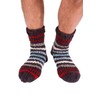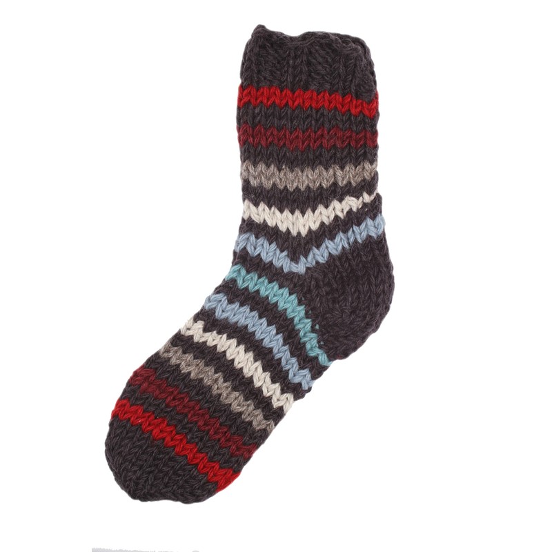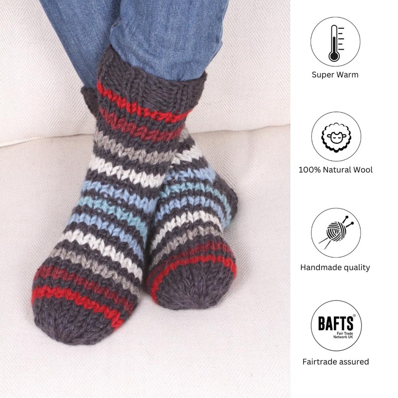 - Distinctive Style: In a masculine charcoal stripe with red, blue, grey and off-white, hand knitting makes each pair of socks unique