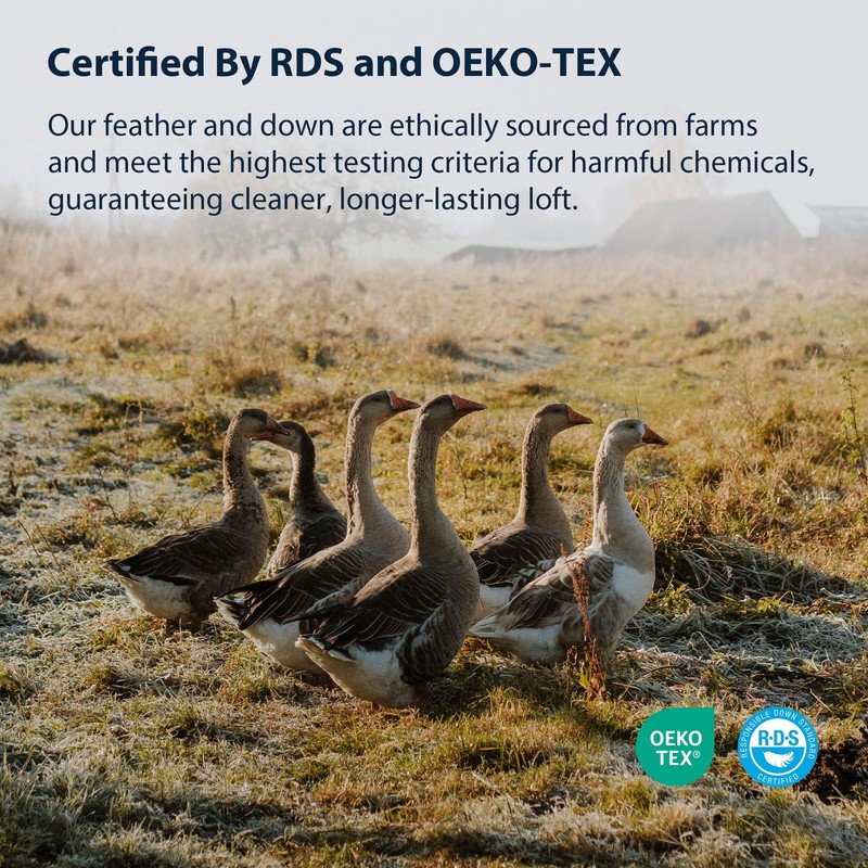 - Hypo-Allergenic: One of the most important and expensive components of our luxury down bedding is the cleaning process. Our bed pillow's feathers and down is ethically sourced and certified by RDS and OEKO-TEX Standard 100 and multiple washed to guarantee a cleaner, longer-lasting loft.