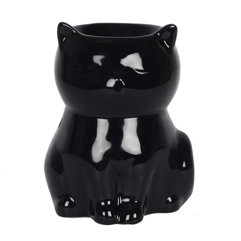 - Cat Oil Burner.|Also Functions as a Candle Holder!|3D Shape. |Shiny + Black. |For Tea Light Candles Essential Oils and Wax Melts!|3.5" W x 3.3" L x 4.7" H. |Made of High-Quality Ceramic.