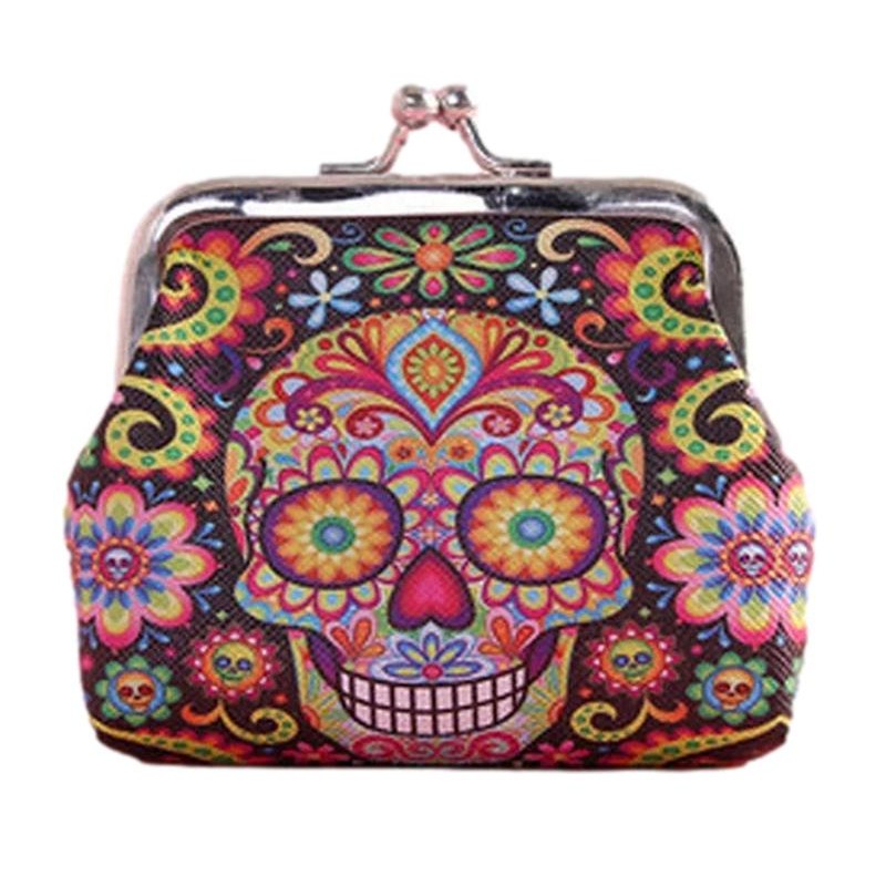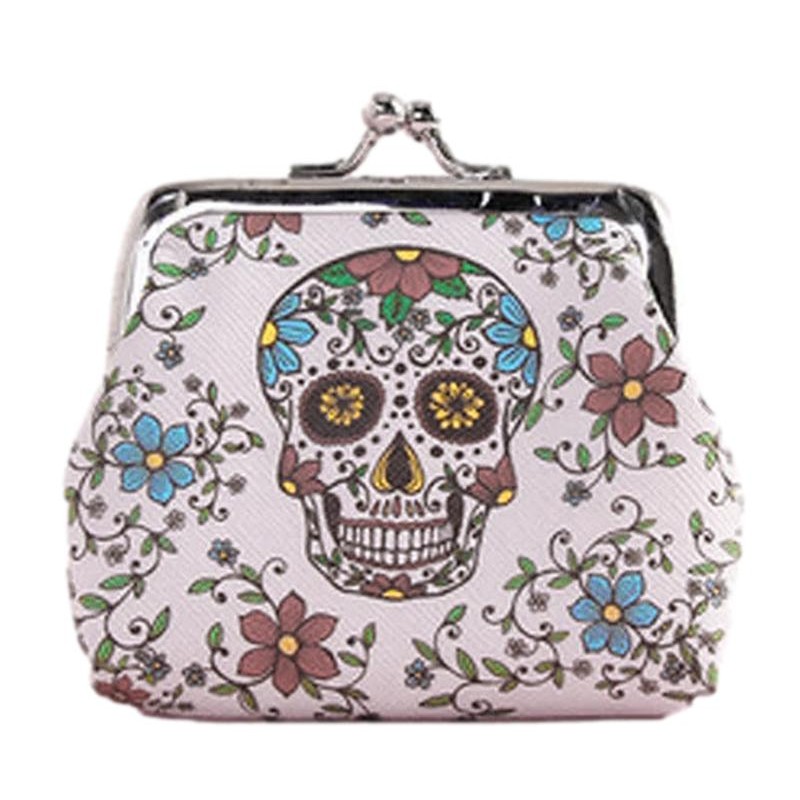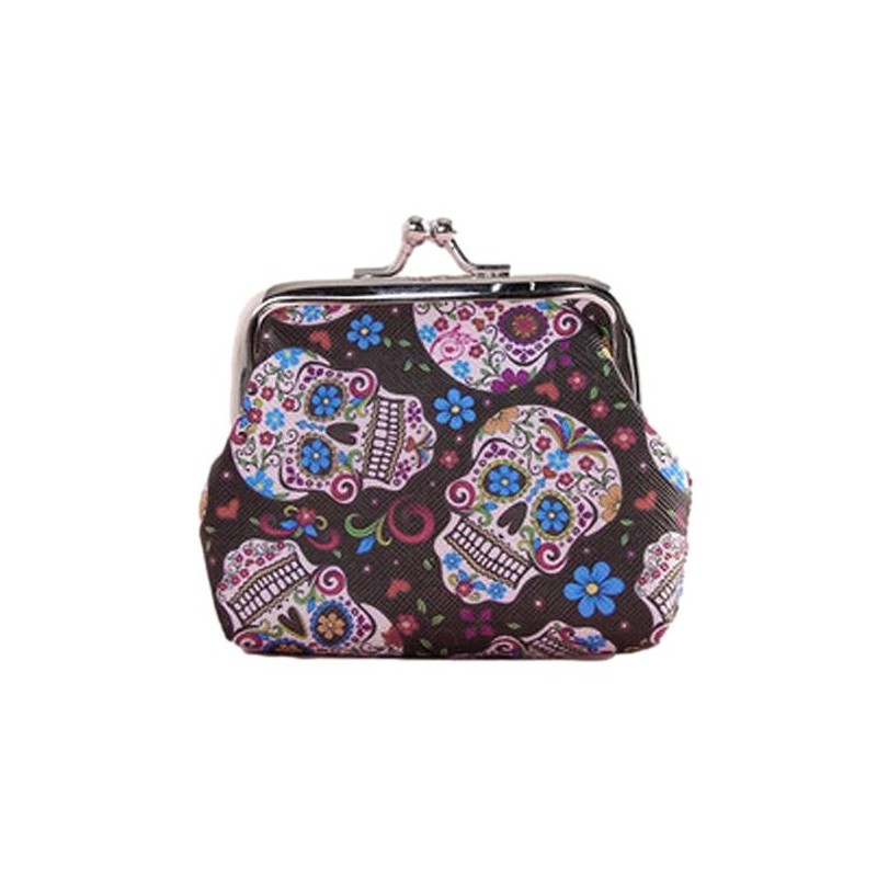 Sugar skull PU leather kiss-lock coin purse bag in cute Dia De Los Muertos themed prints! 3.3" x 3.5". PU leather and zinc alloy. This bag can hold credit cards, coins, candies and small items such as lipstick.