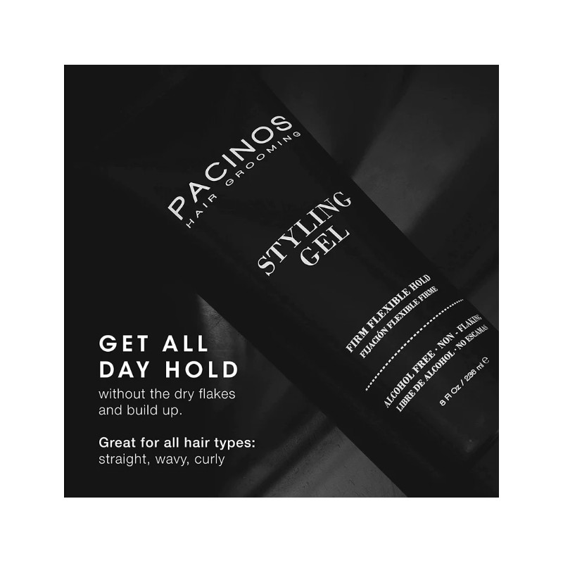 Formulated with water-soluble ingredients, Pacinos Styling Gel will provide an all day hold without the dry flakes and build up.