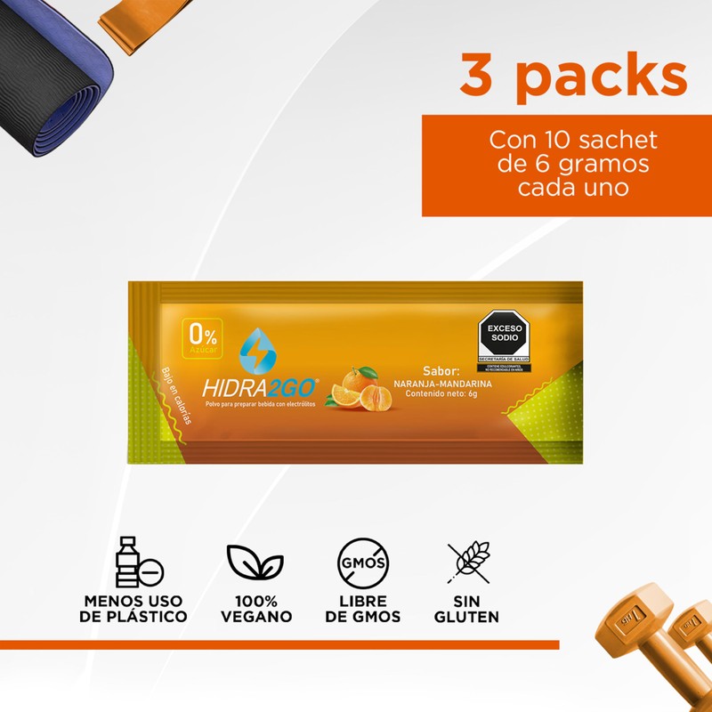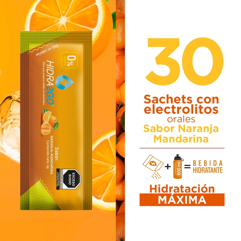 Pack de 30 Unidades - 6gr por Unidad - Electrolitos en Polvo Soluble 600ml | Sabor Naranja Mandarina | Sin Calorias, Sin Azucar, Libre de Gluten y Vegano | 6 gr de Polvo en Sobres | HIDRA2GO