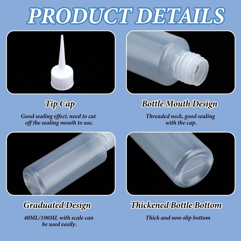 • Fine squeeze tip: the tip of the liquid dispenser bottle is narrow at the top and wide at the bottom, you can trim the length of the extrusion tip according to your needs for fine control
