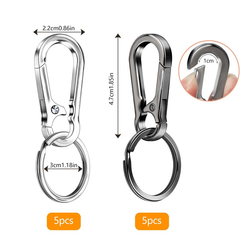 - Box contents: you will receive 10 pieces carabiner key rings (5 pieces silver, 5 pieces grey black), suitable for a variety of different matching styles. Carabiner hook key ring size: 4.7 cm x 2.2 cm. It is easy to carry and practical. Carabiner key ring is designed for camping, travel, car keys, keychains, backpacks and other daily activities that can meet your different life needs.