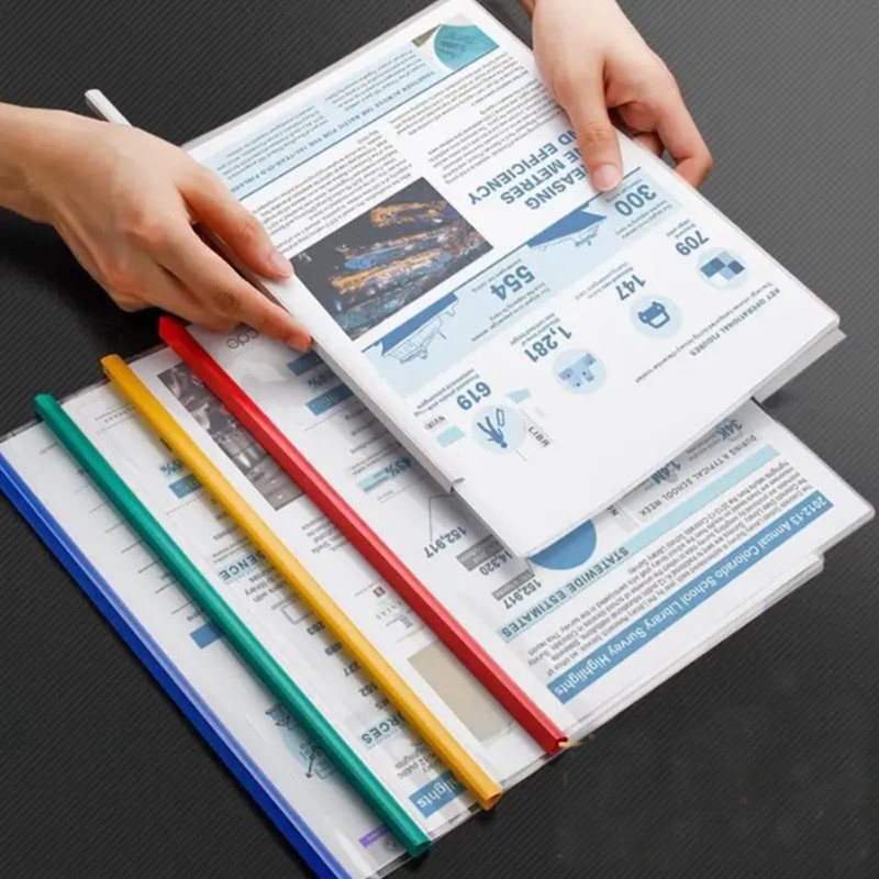 - Easy to use - High transparency report cover that clearly shows the documents and data, and the practical sliding bar allows you to secure documents without having to punch holes. Easy to open and close and add or remove sheets