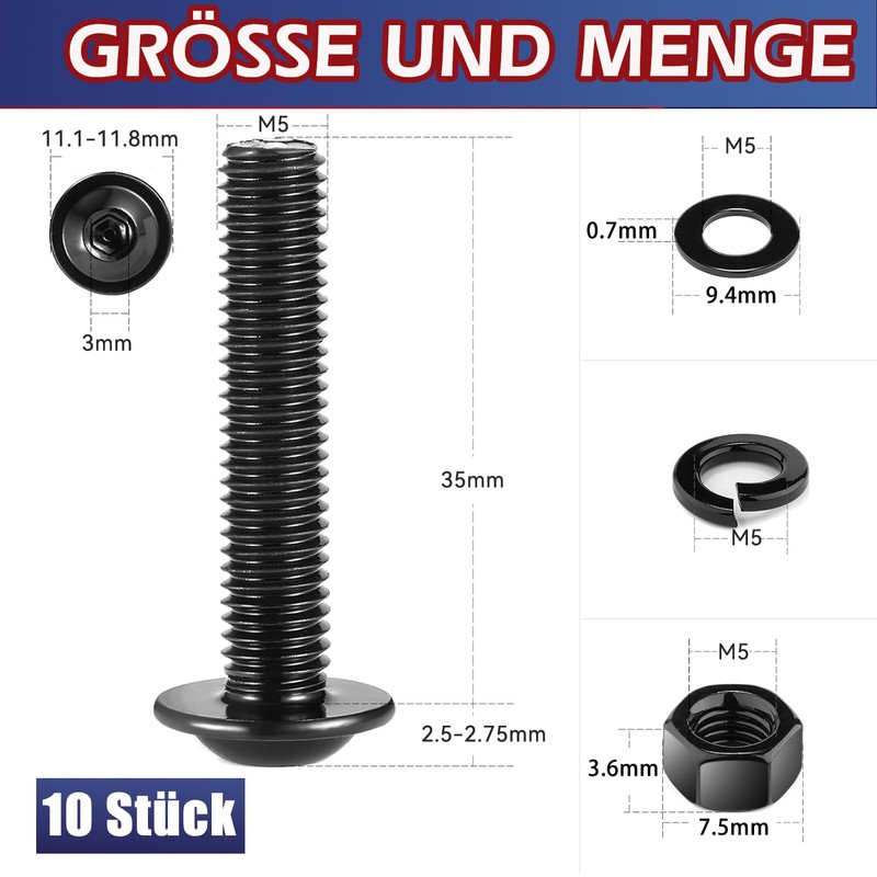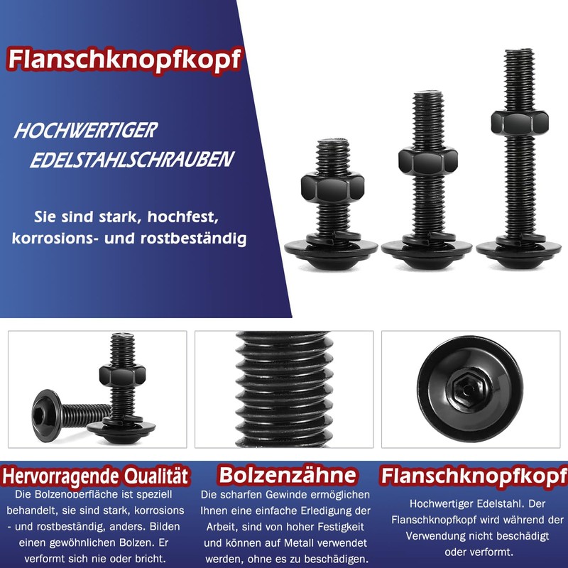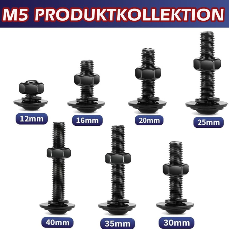 - Hard and not easy to break: M5 screws are made of rust-proof and corrosion-resistant A2 V2A stainless steel with hard texture and does not break easily during use. The outer layer is covered with a layer of black oxide that can effectively protect these screws and nuts and extend their service life. You can also see them in damp indoor and outdoor environments.
