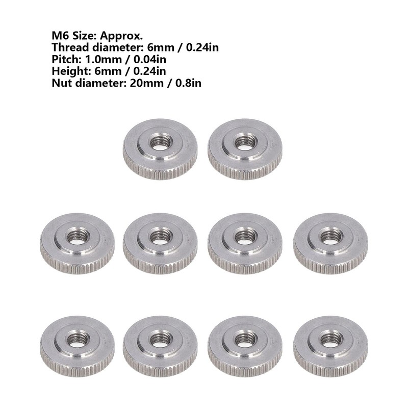Pack of 10 Stainless Steel Knurled Nuts with Flat Head and Through Hole, Hand-Tight Tightening Nut (M6)