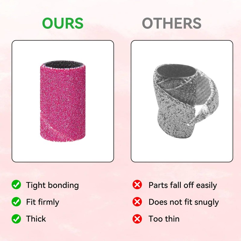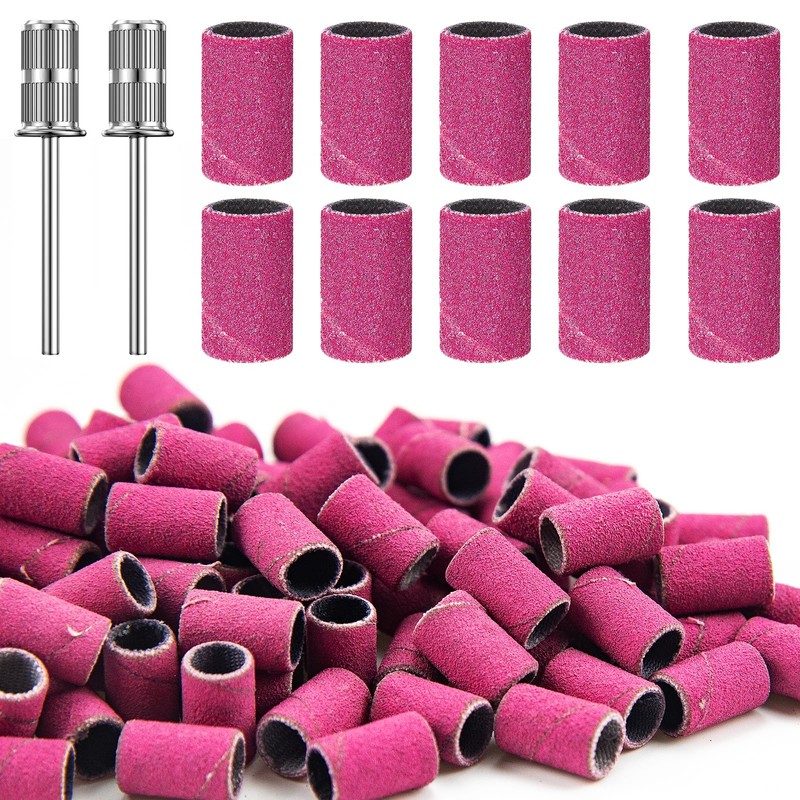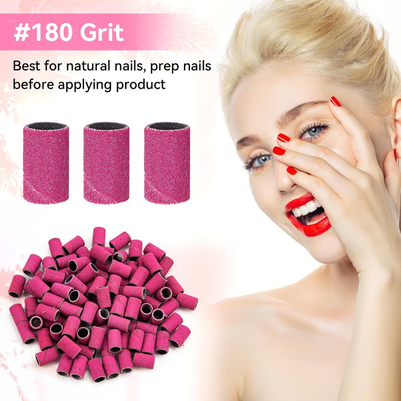 Pack of 100 Bits Grinder Sleeves, Nails, Professional Sanding Belts 180# Grit for Nail Drill, Sander, Sander, Rollers, Nail File for Manicure and Pedicure (Pink)