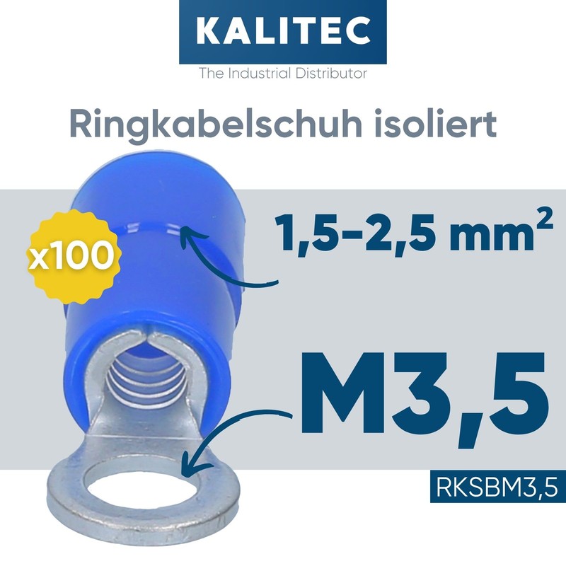 Pack of 100 Kalitec RKSBM3.5 Ring Cable Lug 1.5-2.5 mm² I Partially Insulated M3.5 Blue I PVC Collar I for Connecting Cables or Strands I Cable Lug I Cable Connector I Protects Electrical Connections