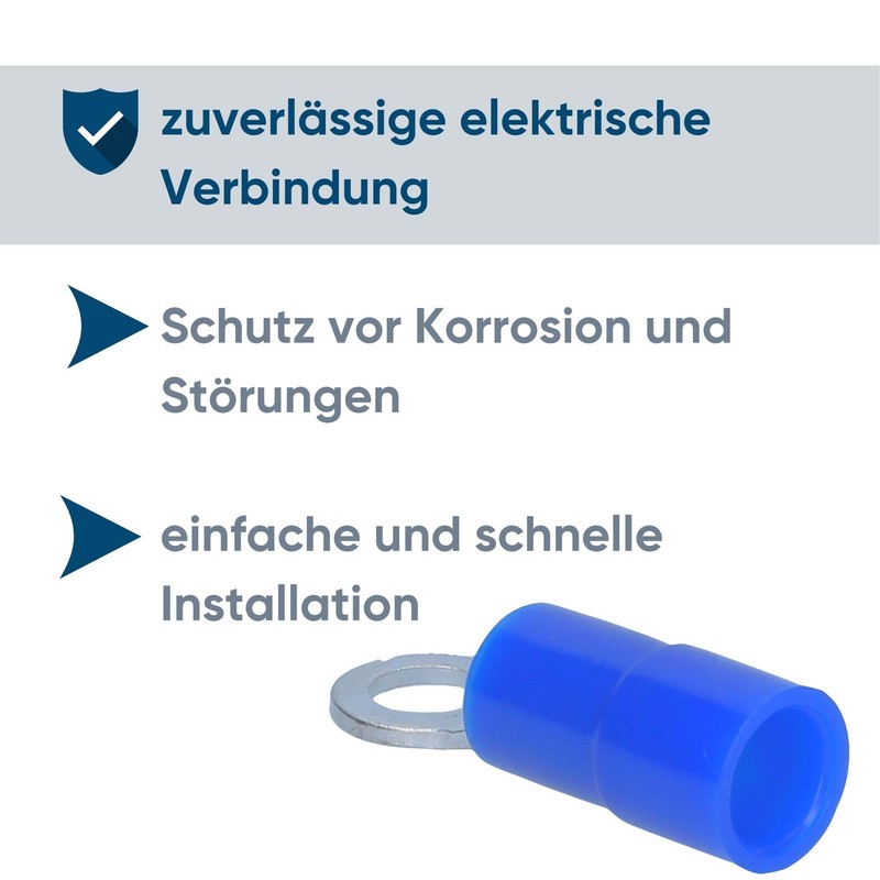 - Thanks to its ring eyelet, the crimp cable lug blue M3.5 is easy to mount on corresponding connections, which allows for quick and easy installation