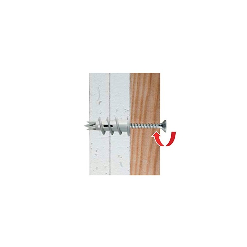 - Integrated centring drill tip, quick installation without pre-drilling, no setting tool required, screwdriver is sufficient for screws of diameter 3.5 - diameter 4.5 mm max. Working depth is only 30 mm better extraction values thanks to offset axes for gypsum fibreboard, Fermacell as well as in aerated concrete. Screw lock