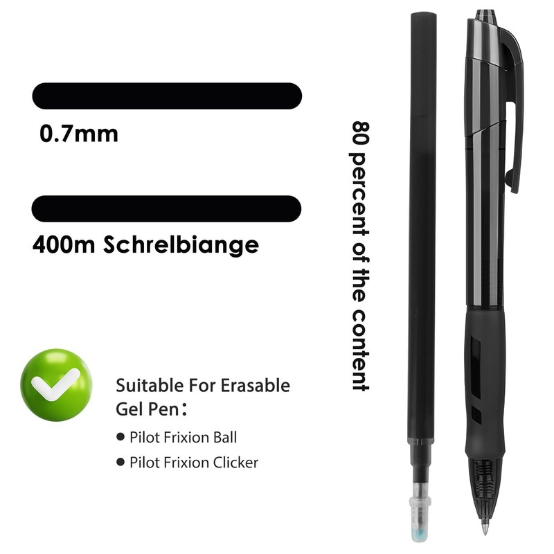 - CAPACITY AND DURABILITY Get 12 erasable rollerball refills equipped with a writing length of up to 400 meters. These refills provide a durable and reliable writing experience for everyday use in school, office or home.