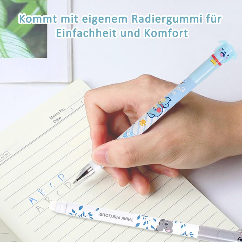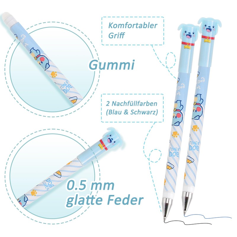 - What is included in the box? The box contains 12 erasable pens with cute lions, elephants, rabbits, chicks, puppies and bears. Each design is available in both black and blue ink to meet your needs! Makes these special erasable ink pens a perfect gift for children, friends, students and family.