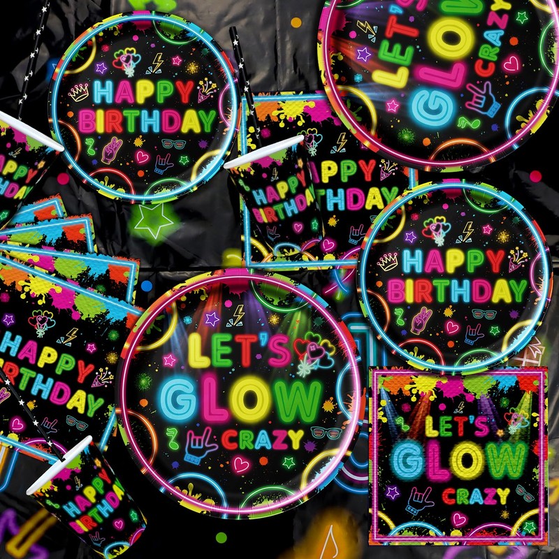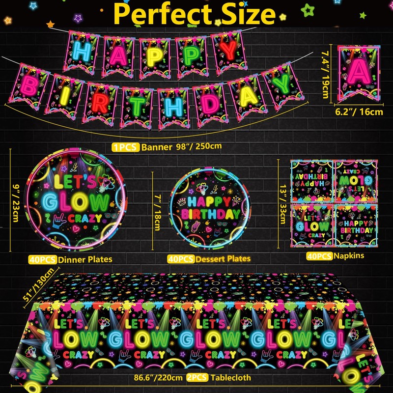 - Glow neon party supplies included: 40 x 9 inch dinner plates, 40 x 17.8 cm dessert plates, 40 x napkins, 2 x Let's Glow tablecloth, 1 x Happy Birthday banner. You will receive 123 pieces for neon birthday party decorations. Sufficient quantity and bright colors can meet your needs and replacement. They can be used to decorate your neon themed party table, creating a party atmosphere.