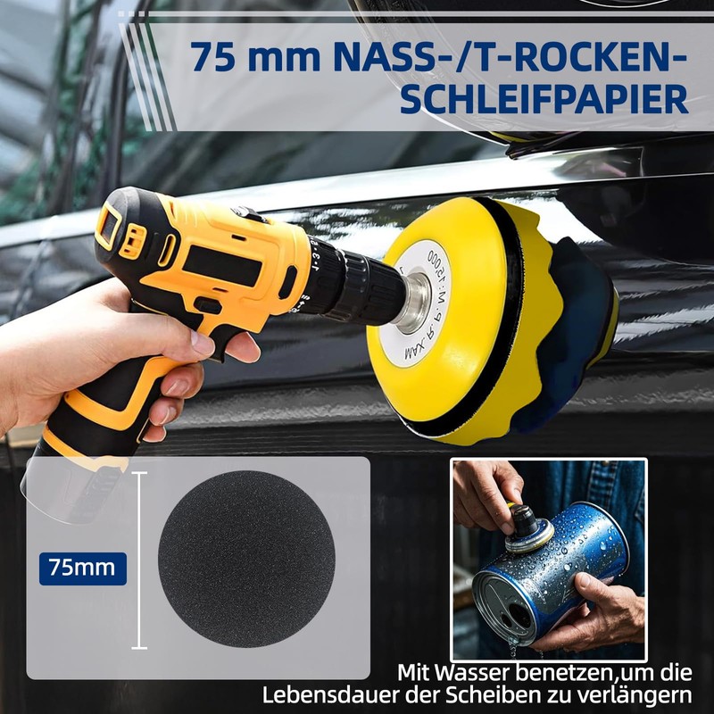 - Comprehensive polishing set for professionals: the set contains 120 pieces of 75 mm wet sandpaper in the grits from 60 to 10,000, 2 PU sanding plates, 2 sanding pads, 2 high fibre pads and 4 polishing sponges - ideal for precise grinding and polishing with cordless screwdriver or drill. Perfect for car preparation, DIY work and more.