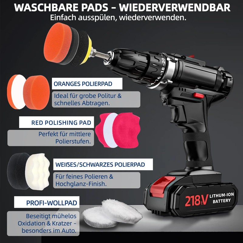 Our polishing kit not only saves you time, but also delivers professional results - without any effort. Thanks to the optimally coordinated components and the easy handling, you can achieve shiny results in no time at all, whether for vehicle care, furniture restoration or DIY projects. No more uneven pressure, overheated pads or poorly fitting sanding discs - the sophisticated construction ensures stability and efficiency with every use.