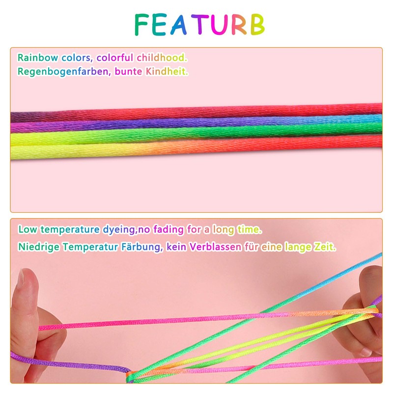 - Educational toy for children: finger twist thread game finger game when playing with peers or parents with educational toys, children unconsciously develop their social relationships, develop the spirit of cooperation. These rainbow rope help promote brain development and develop children's skills, such as hand brain, grip, vision, intellectual development, sensory coordination, hearing, hands and eyes.