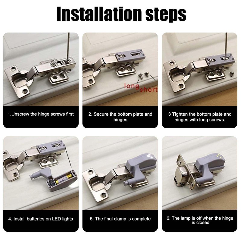 - EASY TO INSTALL Easy to install and convenient to use. After installing it on your cabinet hinge with battery, it will brighten the entire cabinet when opening the cabinet door. When closing the cabinet, the light turns off.