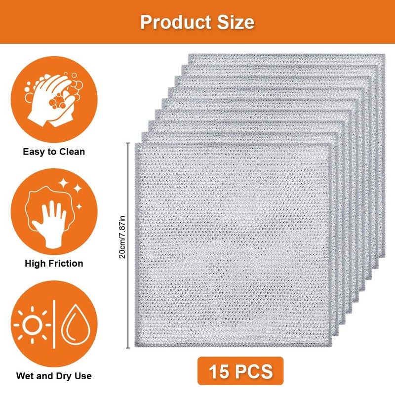 - Package list: you will receive 15 pieces multi-purpose wire dishwasher cloths for wet and dry, the size is 20 x 20 cm, with strong stain removal ability, the quantity and size can meet your daily needs, it is an ideal helper for kitchen cleaning.