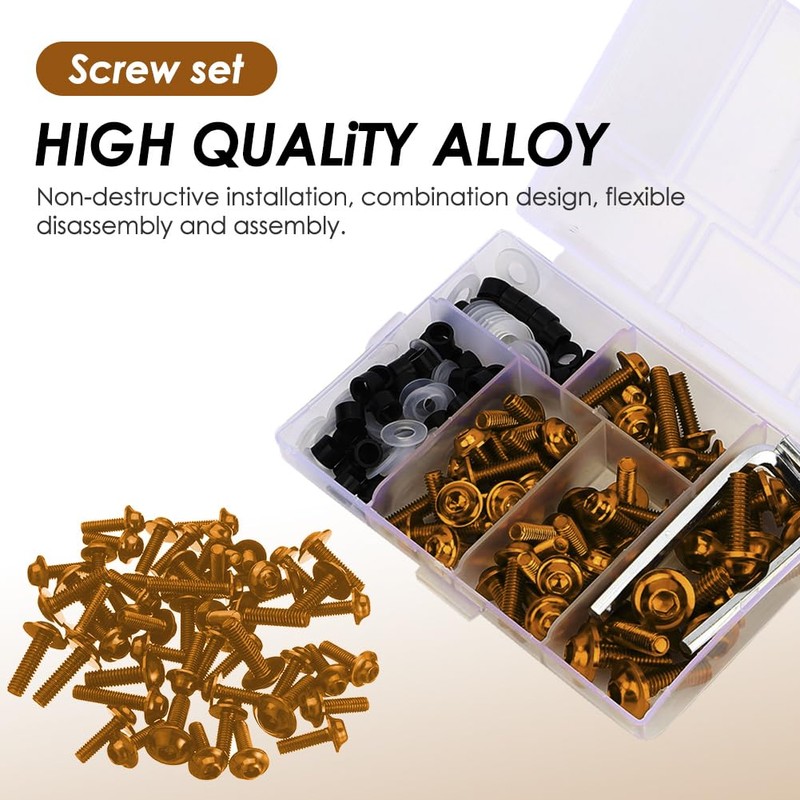- 158 pieces motorcycle fairing screws kit: This is a cool fairing screw replacement accessory that gives your motorcycle a whole new, stylish look. The kit contains 38 pieces M5 screws 16 mm, 12 pieces M6 screws 20 mm, 2 pieces M5 screws 20 mm, 12 pieces M6 plastic seal, 40 pieces M5 plastic seal, 40 pieces M6 plastic ring, 12 pieces M5 plastic ring, M6 wrench and M5 wrench.