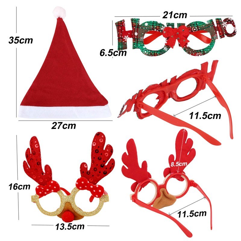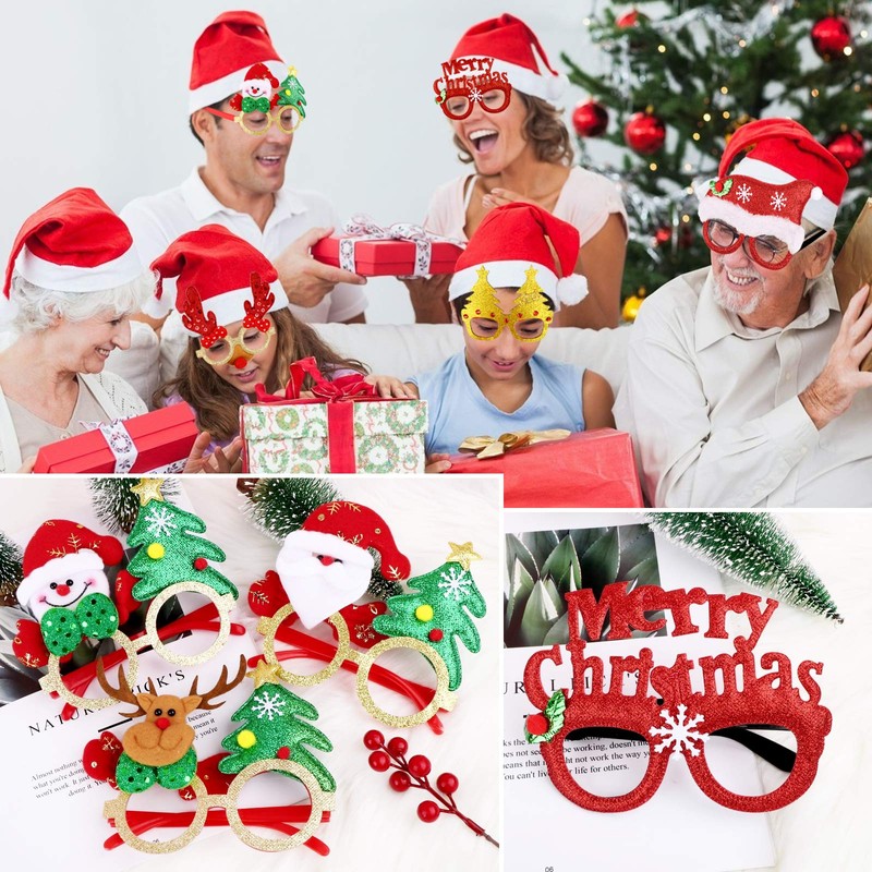 - Box contents: 8 pairs of fun Christmas glasses and 8 Christmas hats.