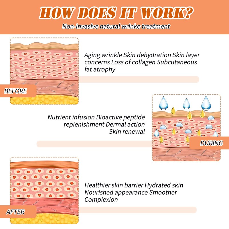 - Easy and comfortable: the use of wrinkles plaster is very easy and convenient. First clean the skin around your forehead and keep it dry. Then remove the anti-wrinkle plaster battery and peel off the film. Then gently smooth the wrinkles on your head and apply forehead pads against wrinkles to the areas in need of care. Finally, wait 1 hour or overnight before removing the plaster.