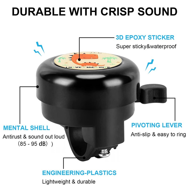 - Innovative design: bicycle bell with 8 interchangeable cute stickers (small dinosaur/unicorn/ice/child), looks new and cute. Compared to the traditional bell, this new function has a more comfortable operation, fits perfectly discreetly on all handlebars.