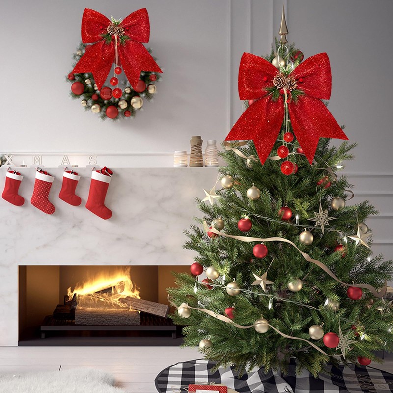 - Christmas bow set includes: 2 red bow sequins, it is the best addition to decorate the Christmas tree, hang it on the fire in front of the door or hang it on the edge of the yard, hang on the window in the room, make the whole house full of Christmas atmosphere