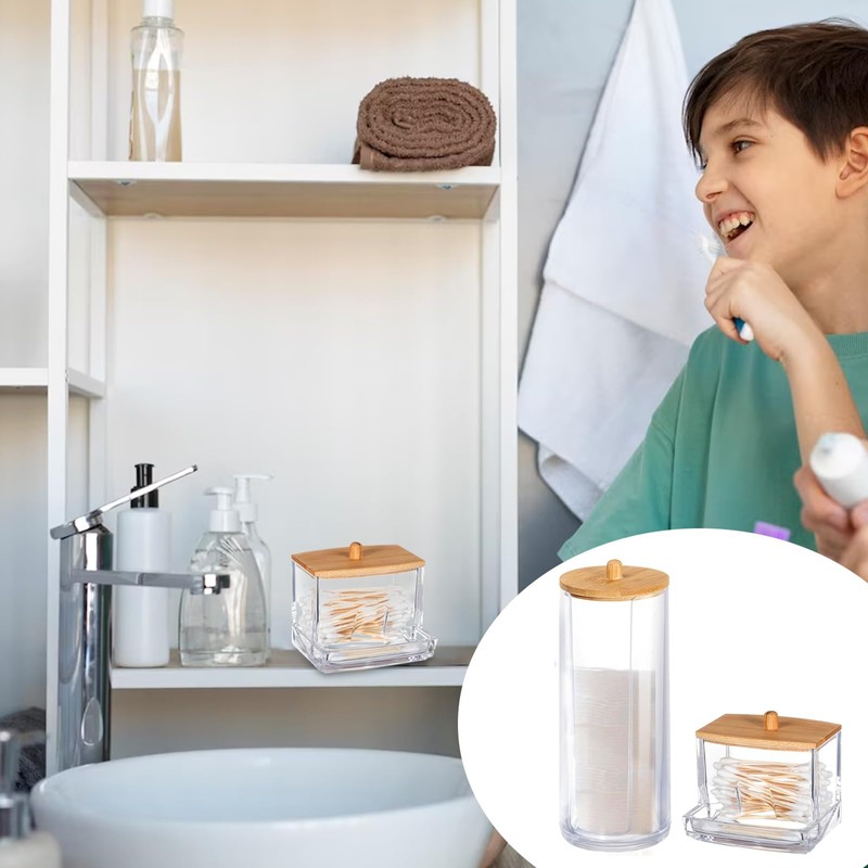Pack of 2 Cotton Buds Holder, Cotton Buds Storage, Cotton Pad Holder with Bamboo Lids, Transparent Storage of Cotton Pads, for Living Room, Bedroom, Bathroom