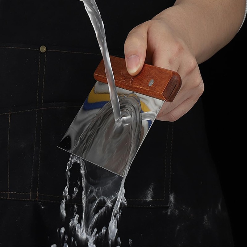 - The scraper dough cutter is made of stainless steel with a wooden handle. Elegant appearance and good workmanship. The scraper is inexpensive.