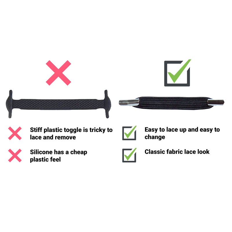 - Velcro laces with large bows, silicone laces and other alternatives are very uncool and just do not look good. These laces imitate the look of standard laces but without the big loop. As they are made of elastic nylon, they imitate the beautiful fabric look of laces