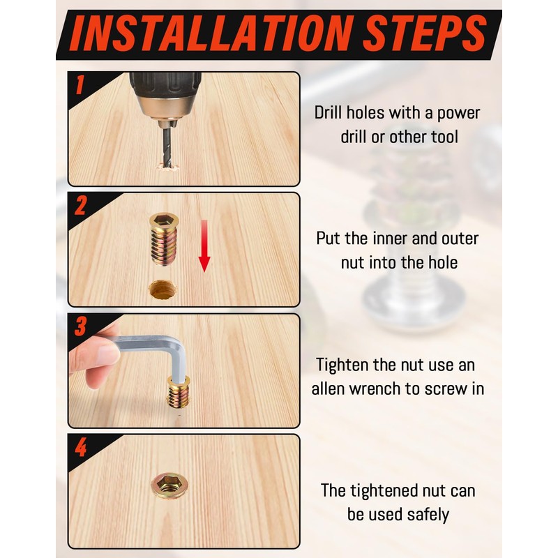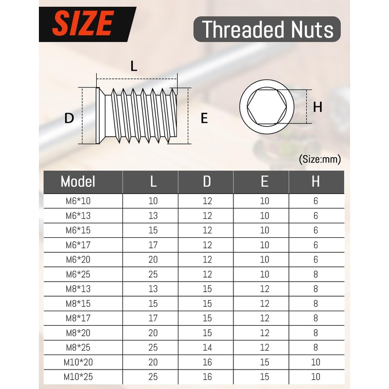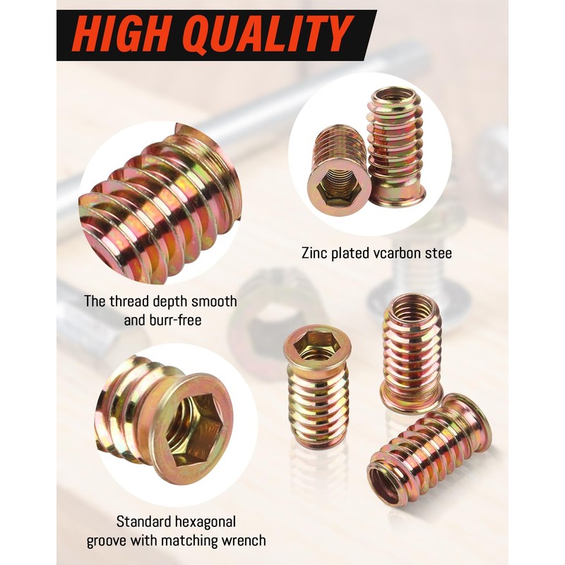 - Design: threaded insert wood has exquisite craftsmanship, clear and deep threads, smooth surface without burrs, high hardness, screwed nut strong practicality and biting force.