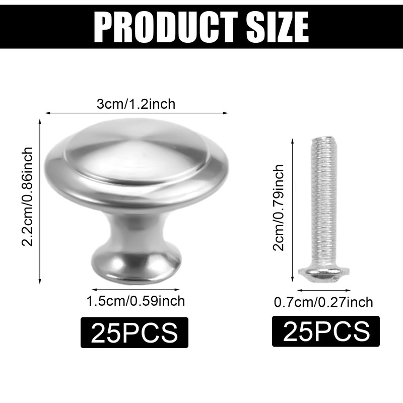 - Package contents: contains 25 stainless steel furniture knobs (30 mm diameter and 23 mm height) and 25 matching screws (2.2 cm length), stainless steel furniture knobs that are thick enough to fit most plates; cabinet knobs metal round enough for your daily use and replacement needs.
