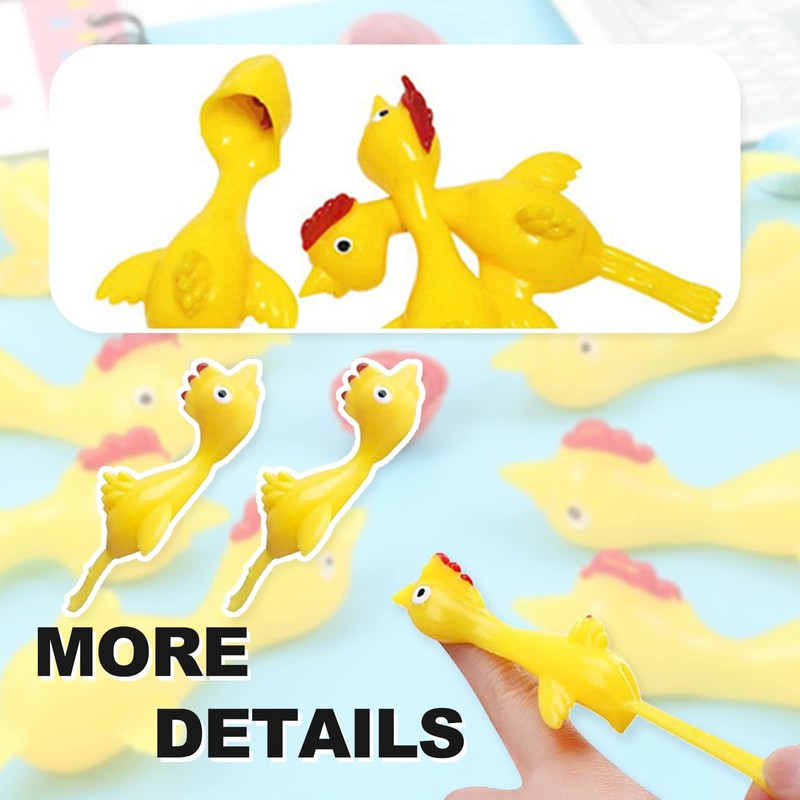 - EASY TO PLAY These stretchy chicks are easy to play. All you have to do is hook the head of the rubber chicken to your finger and pull it back and release.