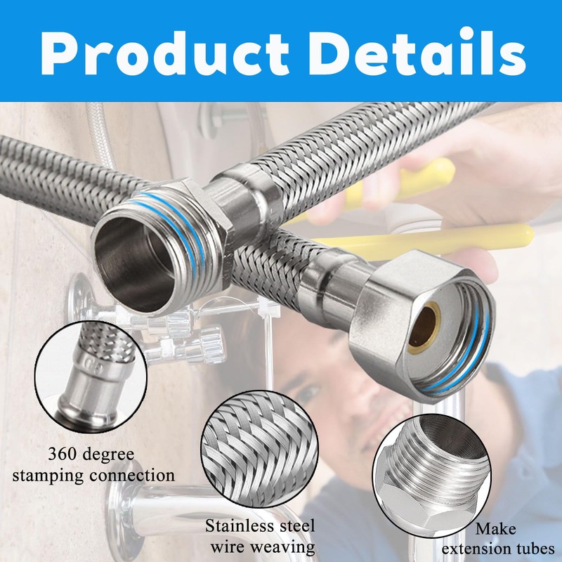 - High-quality materials: the reinforced hose is made of rust-proof 304 stainless steel; connection hose fitting precision-woven for optimal safety and durability; water connection extension tap hose corrosion resistant for a long service life.