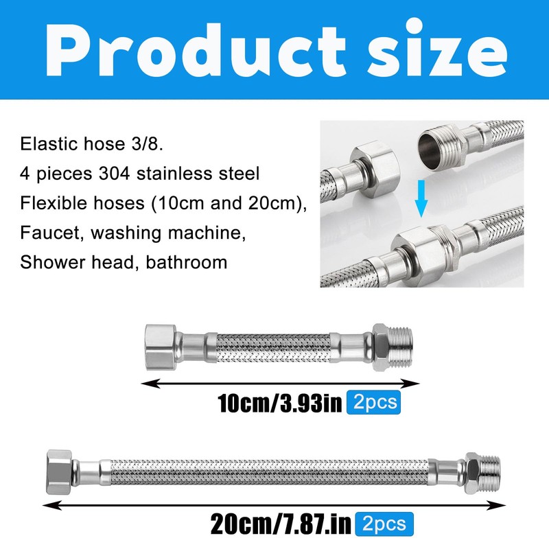- Flexible hose 3/8 inch: you will receive 2 x 20 cm and 2 x 10 cm flexible hoses; connection hose fitting flexible and twist-proof hoses provide a reliable connection between tap and angle valve in the kitchen or bathroom.