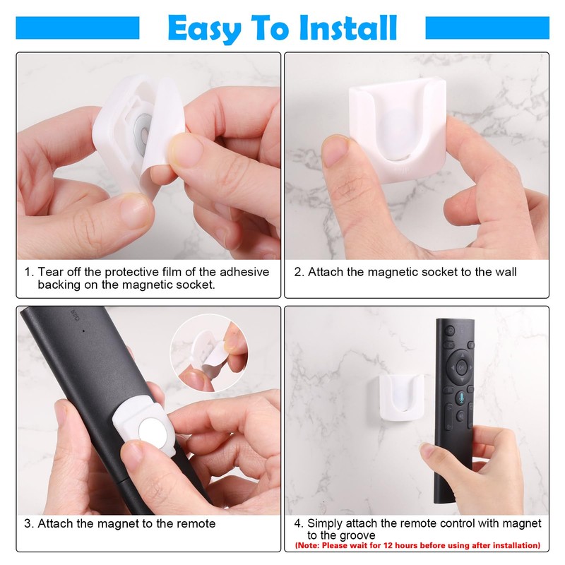 - Easy to install: no need to drill. Simply peel off the adhesive back of the magnetic slot and attach it to a flat surface and then stick the magnetic compartment to the remote control. After installation, please wait twelve hours before using it.