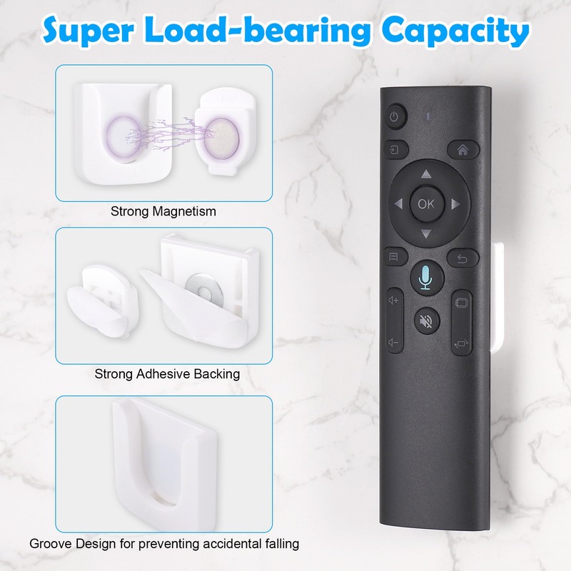 Strong magnetism. Super sticky: the built-in thick magnet ensures strong magnetism, so that the remote control holder can carry a weight of 130 g. And the adhesive backing provides strong adhesion, which allows the remote control holder to stick firmly to the wall.