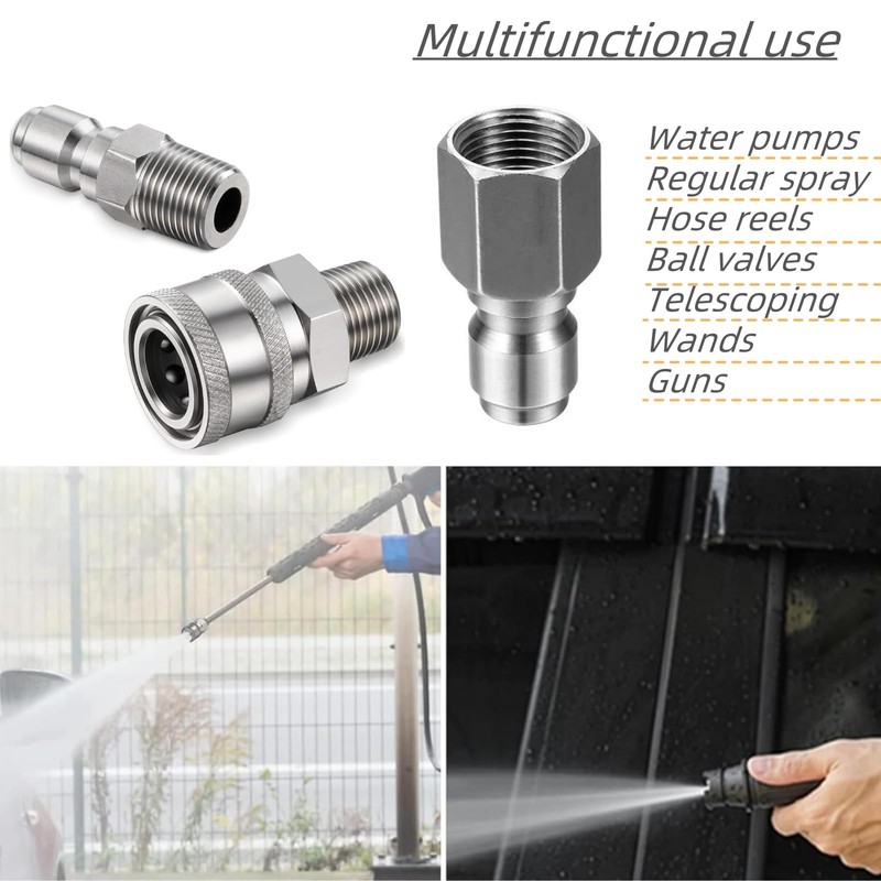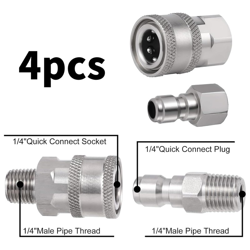 • Material: Our pressure washer coupling 1/4 inch is made of stainless steel, which is robust against breakage and deformation. The stainless steel does not fade and ensures a long service life.