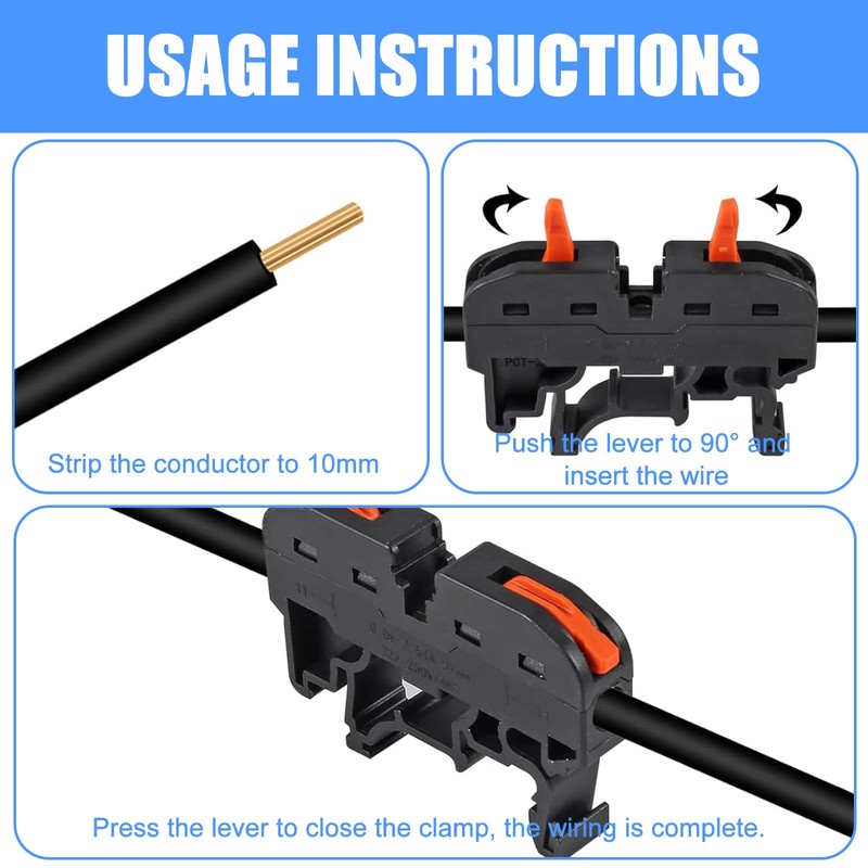 - Easy and quick installation: DIN rail terminals without screws, easy to install. Insert the clamp into the rail, slide the clip up and connect the cable