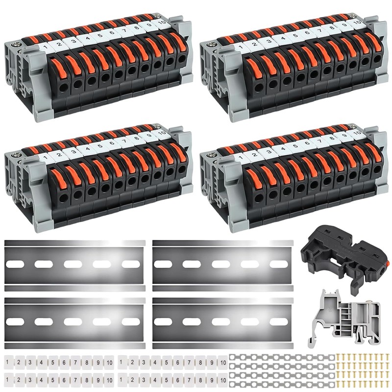 - Full set: 40 black DIN rail terminals, 4 marking strips, 4 10 mm rails, 40 screws, 8 mounting bases and 4 parallel rails included. All in one pack, perfect for different projects