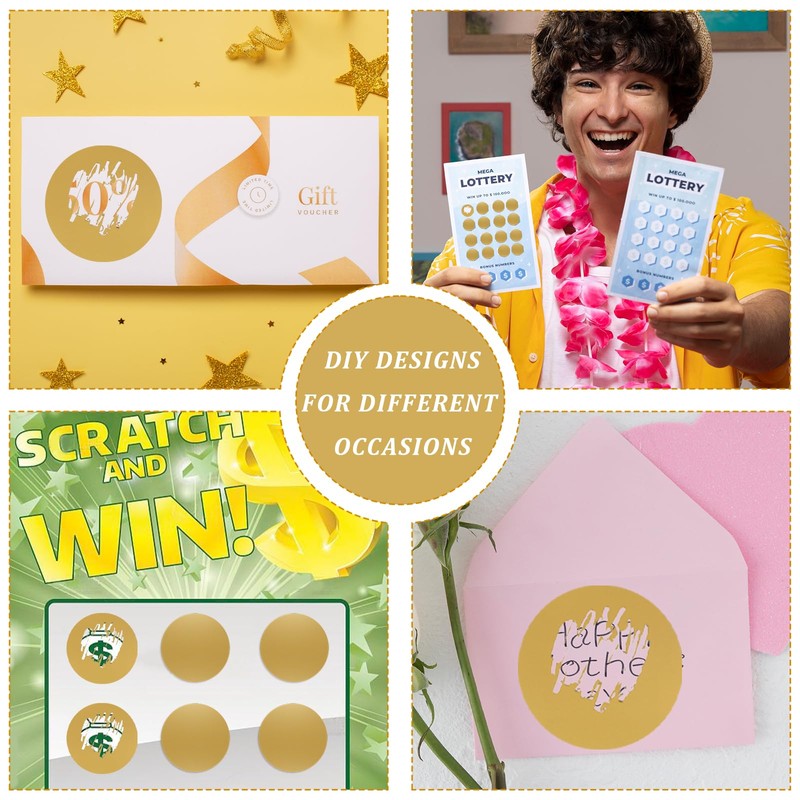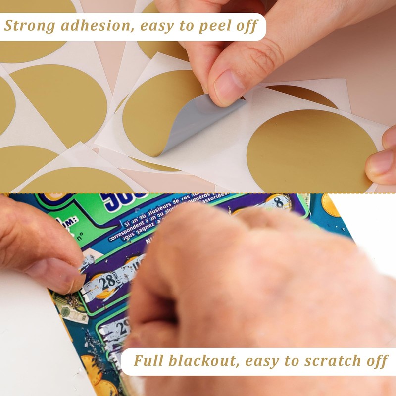 • Package contents: Each pack contains 50 sheets of scratch stickers, the colour is gold, on each sheet there are two round scratch stickers, the size of the scratch stickers is 5 cm in diameter and the size of each sheet is 12 x 6 cm. The quantity is enough to meet your daily needs.
