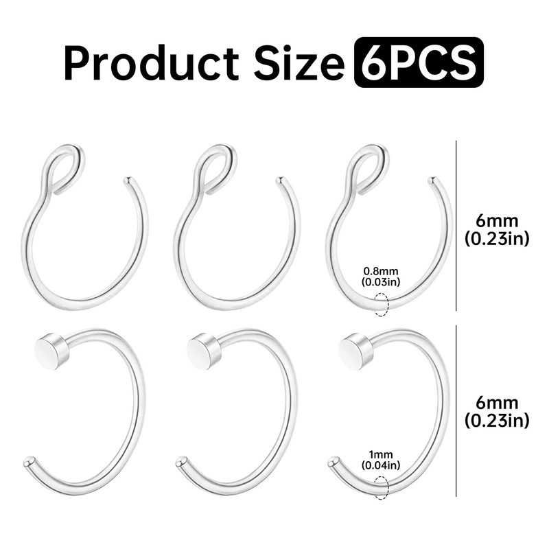 Pack of 6 fake nose piercing rings, thin, nose ring, gold, fake nose ring, silver nose ring, nostril piercing nose, nose piercing rings, septum lip piercing set for nostril, breasts, ear lip piercings