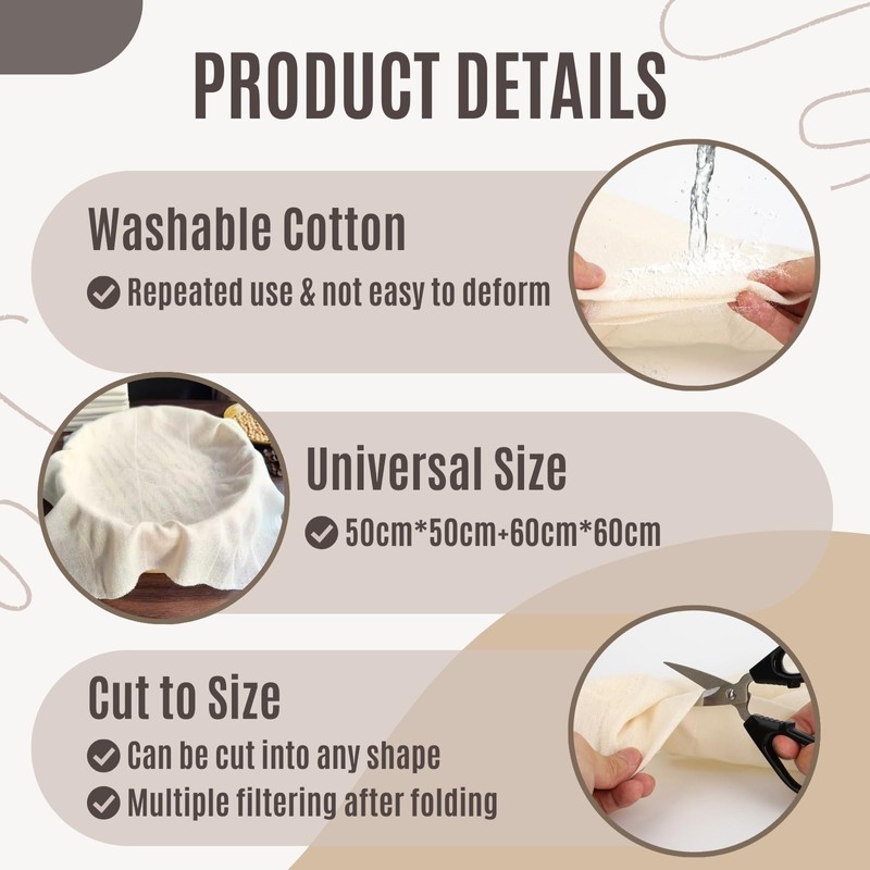 To meet the different cooking needs, the filter cloth set is carefully matched to two practical sizes: 4 pieces of 50 cm x 50 cm and 2 pieces of 60 cm x 60 cm, which are suitable for both large bowls and small plates as well as for a variety of containers. The versatile sizes allow the cloths to be used directly, fold them to increase filter density, or cut them to specific situations, making them flexible and practical.