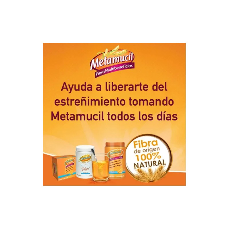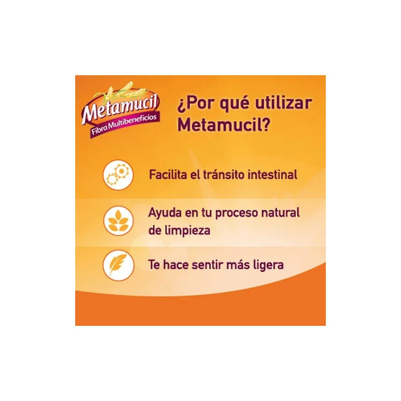 El Metamucil multibeneficios de naranja es un producto de alta calidad que contiene como componente principal el Plantago psyllium que ayuda a mejorar la digestión y el tránsito intestinal.