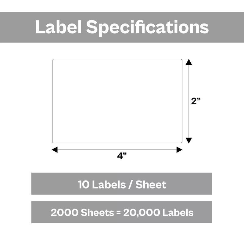 The 10 Labels/Sheet (2000 Sheets) 4"x2" Laser Sheet Labels are an ideal solution for inventory management and shipping needs. Each sheet includes ten labels, offering a total of 20,000 labels in this bulk package. These laser sheet labels are designed in a standard 4"x2" size, providing sufficient space for important information. The labels come in a crisp white color, ensuring readability and professionalism.