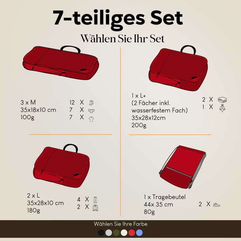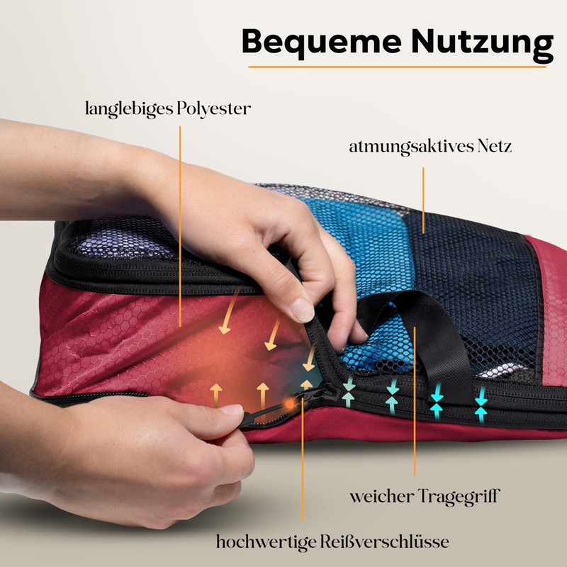 The set includes different sized packing cubes, organiser bags as well as special suitcase packing bags with compression, which are ideal as a suitcase accessory. Whether you are looking for a compact backpack organiser or a comprehensive suitcase organiser compression, our set covers all needs.