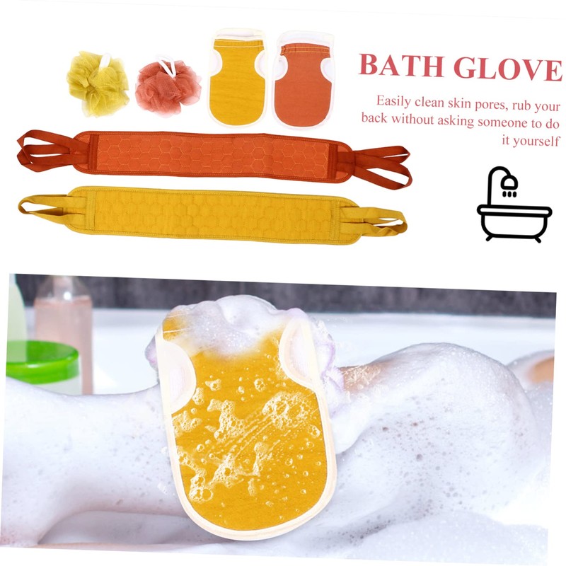 • Shower glove scrubber:this set comes with 2 pieces bath gloves, 2 pieces shower mesh balls and 2 piece back skin scrubber,exfoliating back strap