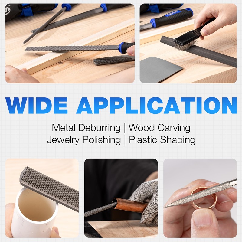 - Wide Applications Across Materials: Master metal deburring, wood carving, plastic shaping, and jewelry polishing effortlessly. Steel files dominate soft materials, while diamond files cut glass/ceramics/stone. Includes specialized wood rasp and 4-way riffler file for niche tasks.
